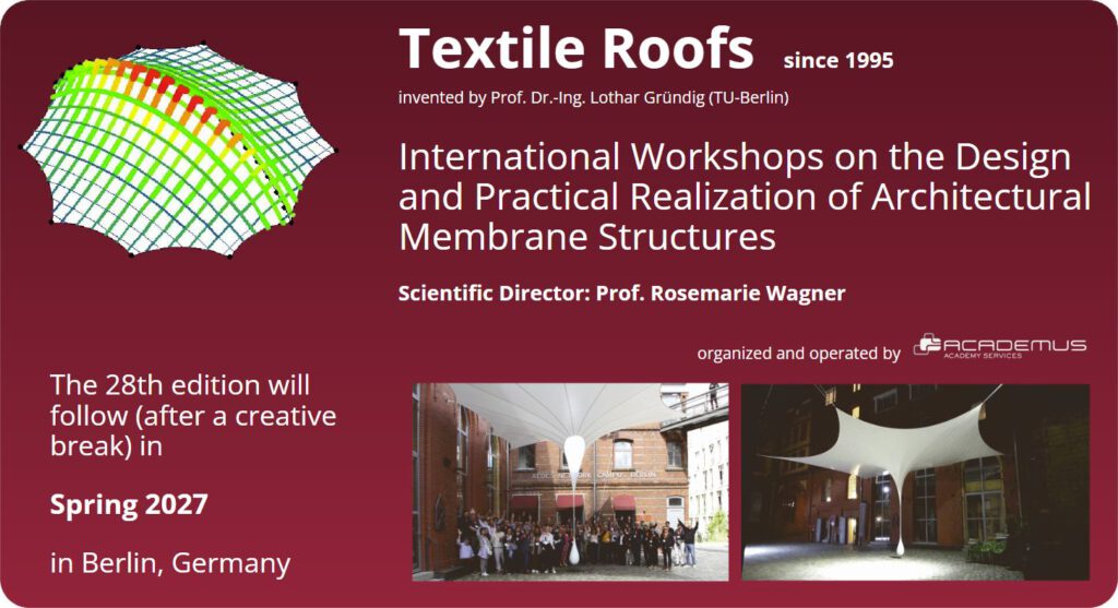 “Textile Roofs” has always been a place for the exchange of knowledge, inspiration and encounters and it will remain so. With openness, creativity, exchange and its community, initially shaped by its founder Prof. Lothar Gründig and since 2014 successfully continued by Prof. Rosemarie Wagner, we aim to strengthen the values that have defined “Textile Roofs” from its inception.
